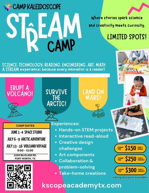 Get ready to create, explore, and discover! Kaleidoscope STREAM Camp blends science, technology, reading, engineering, art, and math into unforgettable, hands-on adventures designed to spark curiosity and build confident, creative thinkers.